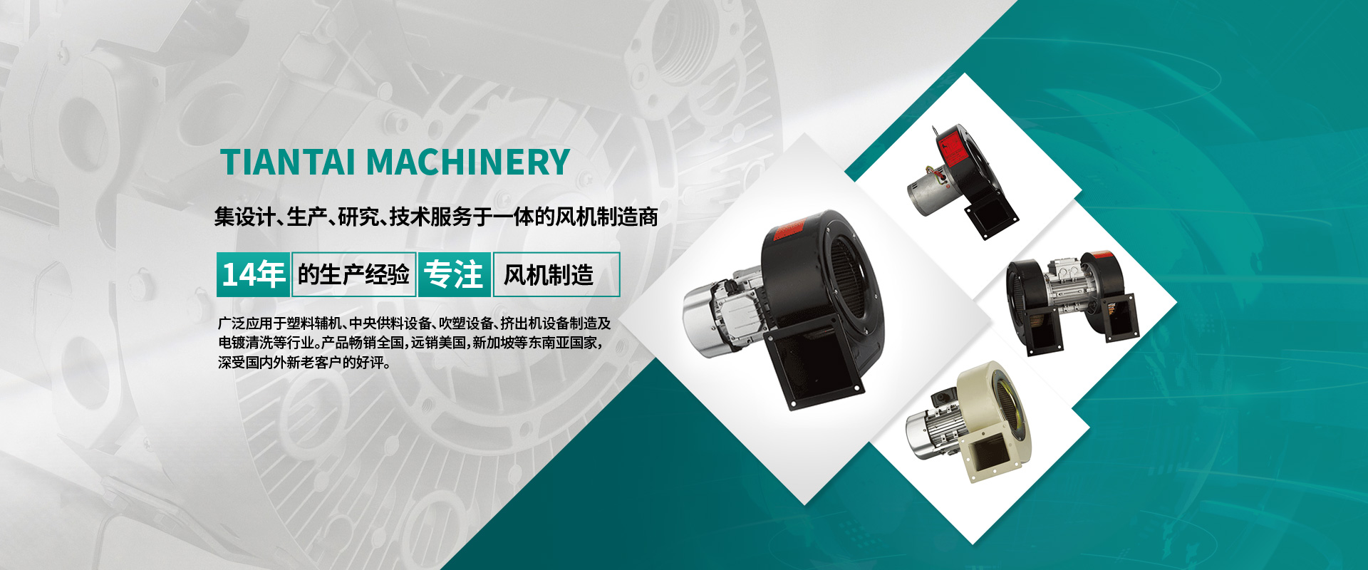 自成立以來(lái),公司不斷引進(jìn)新設(shè)備,新技術(shù),擁有一批行業(yè)資深的工程師投入產(chǎn)品的開(kāi)發(fā)與研究,對(duì)產(chǎn)品質(zhì)量進(jìn)行嚴(yán)格的監(jiān)控,天泰機(jī)械有限公司自主開(kāi)發(fā)生產(chǎn)的“TIANZELU”牌風(fēng)機(jī)廣泛應(yīng)用于塑料輔機(jī)、中央供料設(shè)備、吹塑設(shè)備、擠出機(jī)設(shè)備制造及電鍍清洗等行業(yè)。產(chǎn)品銷(xiāo)往全國(guó),遠(yuǎn)銷(xiāo)美國(guó),新加坡等東南亞國(guó)家,深受?chē)?guó)內(nèi)外新老客戶(hù)的好評(píng)。